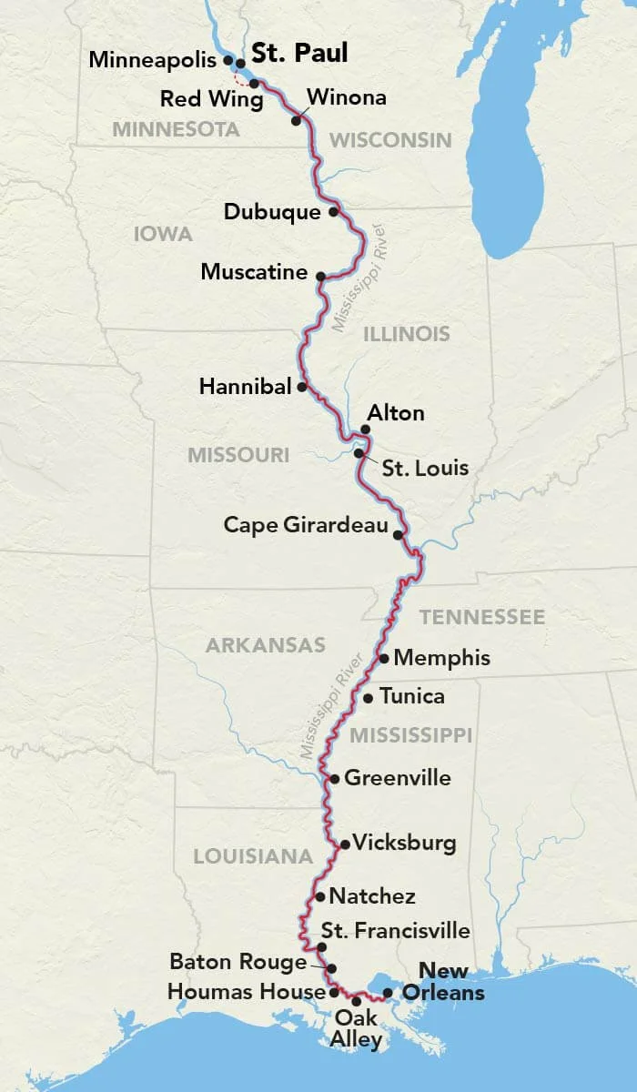 This itinerary follows the cultural backbone of the South. You’ll sail from New Orleans to Memphis with stops in Baton Rouge, Natchez, Vicksburg, and Greenville, tracing the roots of jazz, blues, literature, and Southern cuisine.